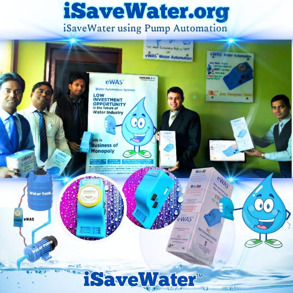 iSaveWater.org & products eWAS®️ Water Automation System turns ON/OFF water pump automatically. Water is used everyhouse, building, complex, etc. and so water pump. Manual use of water pump wastes huges amount of water due to negligence of water pump operations. iSaveWater™️ & eWAS®️ automates the water pump so that water pump turn ON/OF automatically resulting in nil water wastage, thereby saving electricity also.
